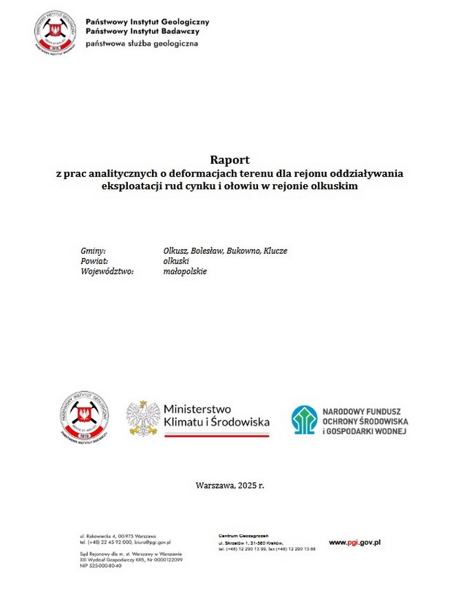 Centrum Geozagrożeń PIG – PIB – oddział w Krakowie, zgodnie ze wcześniejszymi zapowiedziami, opublikowało na swojej stronie internetowej „Raport z prac analitycznych o deformacjach terenu dla rejonu oddziaływania eksploatacji rud cynku i ołowiu w rejonie olkuskim” obejmujący gminy: Olkusz, Bolesław, Bukowno i Klucze.