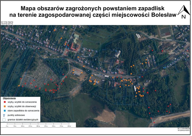 W związku z występowaniem zapadlisk w terenach zabudowanych w Bolesławiu (m. in. bolesławski park – 18.09.2024r., ul. Parkowa w okolicach schroniska dla zwierząt – 20.11.2024r., zabudowania gospodarcze przy byłych mieszkaniach komunalnych - 14.12.2024r., droga do cmentarza polskokatolickiego, a także przy DK94) we współpracy z ZGH Bolesław – na podstawie dostępnej u przedsiębiorcy górniczego dokumentacji i map historycznych oznaczono miejsca publiczne zagrożone wystąpieniem deformacji nieciągłych, m.in. teren Szkoły Podstawowej w Bolesławiu (początek stycznia 2025 roku).