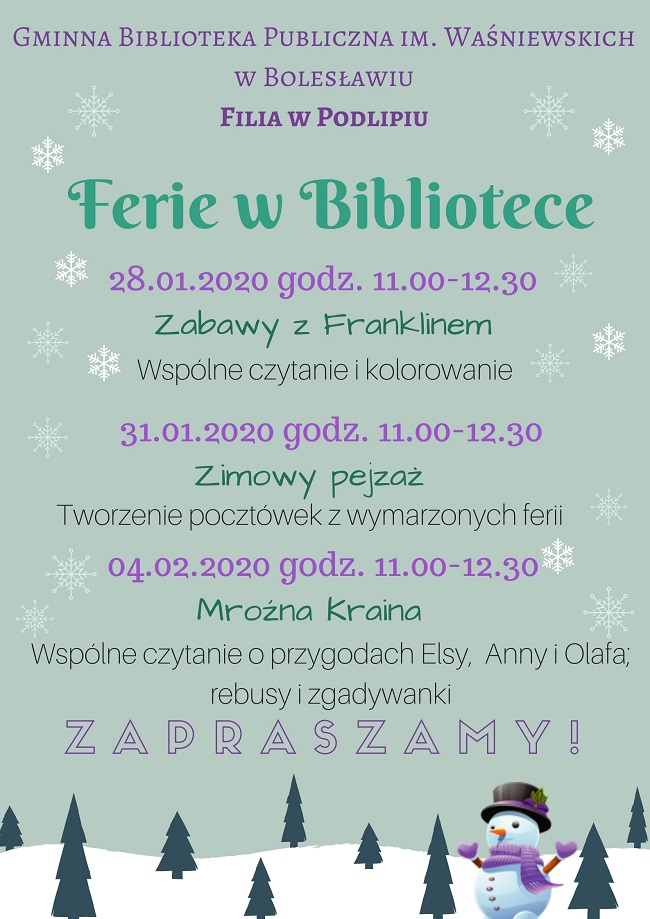 Zapraszamy do Biblioteki w Bolesławiu na zajęcia feryjne oraz do Filii w Krzykawce, Laskach, Podlipiu i Ujkowie Nowym.