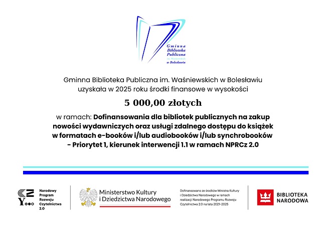 Informujemy, że Gminna Biblioteka Publiczna im. Waśniewskich w Bolesławiu w 2025 roku otrzymała 5000,00 zł ze środków finansowych Ministra Kultury i Dziedzictwa