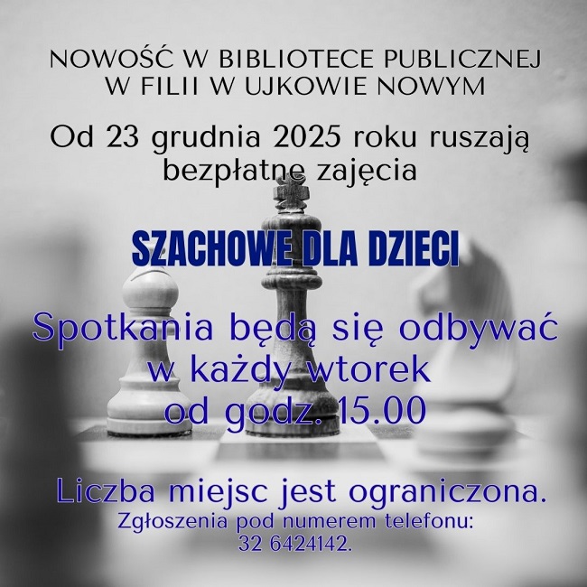 Spotkania będą odbywać się w każdy wtorek o godzinie 15:00 w bibliotece w Ujkowie Nowym ul. Długa 1. Zajęcia poprowadzi pracownik biblioteki, prywatnie pasjonat królewskiej gry, który od lat rozwija swoje umiejętności i posiada III kategorię szachową. Dzięki temu uczestnicy otrzymają rzetelne wprowadzenie do zasad gry oraz praktyczne wskazówki pomagające rozwijać swoje szachowe talenty.